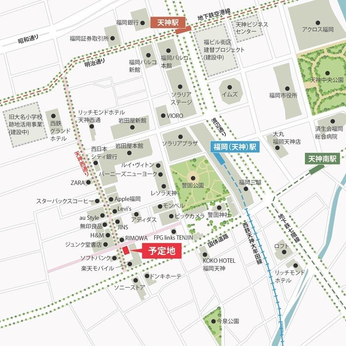 「FUNDES天神西通り」は、九州最大の商業集積地である福岡天神に位置し、西鉄天神大牟田線「西鉄福岡(天神)」駅から徒歩4分というアクセスに優れた立地に所在します。本物件が所在する「天神西通り」は、平日・休日を問わず、近隣オフィスワーカーや買物客をはじめ幅広い年齢層の来客が見込まれる商業集積エリアであり、福岡天神エリアにおけるプライムストリートとなっております。