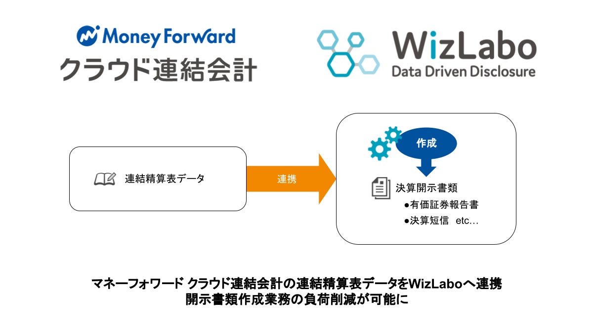 「WizLabo」とのAPI連携は「マネーフォワード クラウド会計Plus」に対応しておりましたが、今回「マネーフォワード クラウド連結会計」ともAPI連携を開始することで、単独決算だけでなく、連結決算業務および開示書類の作成を効率化します。
