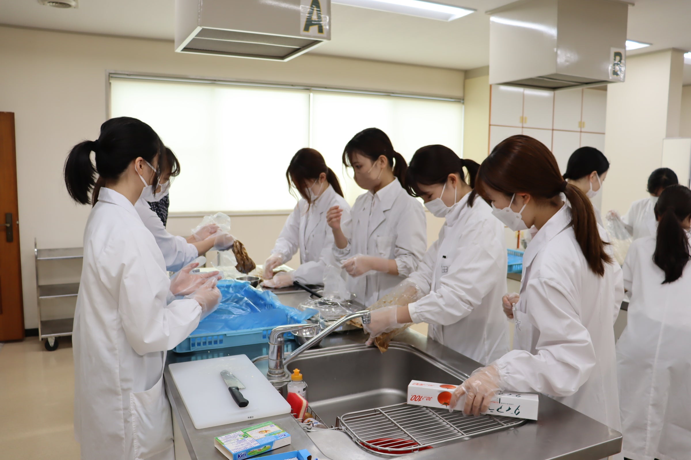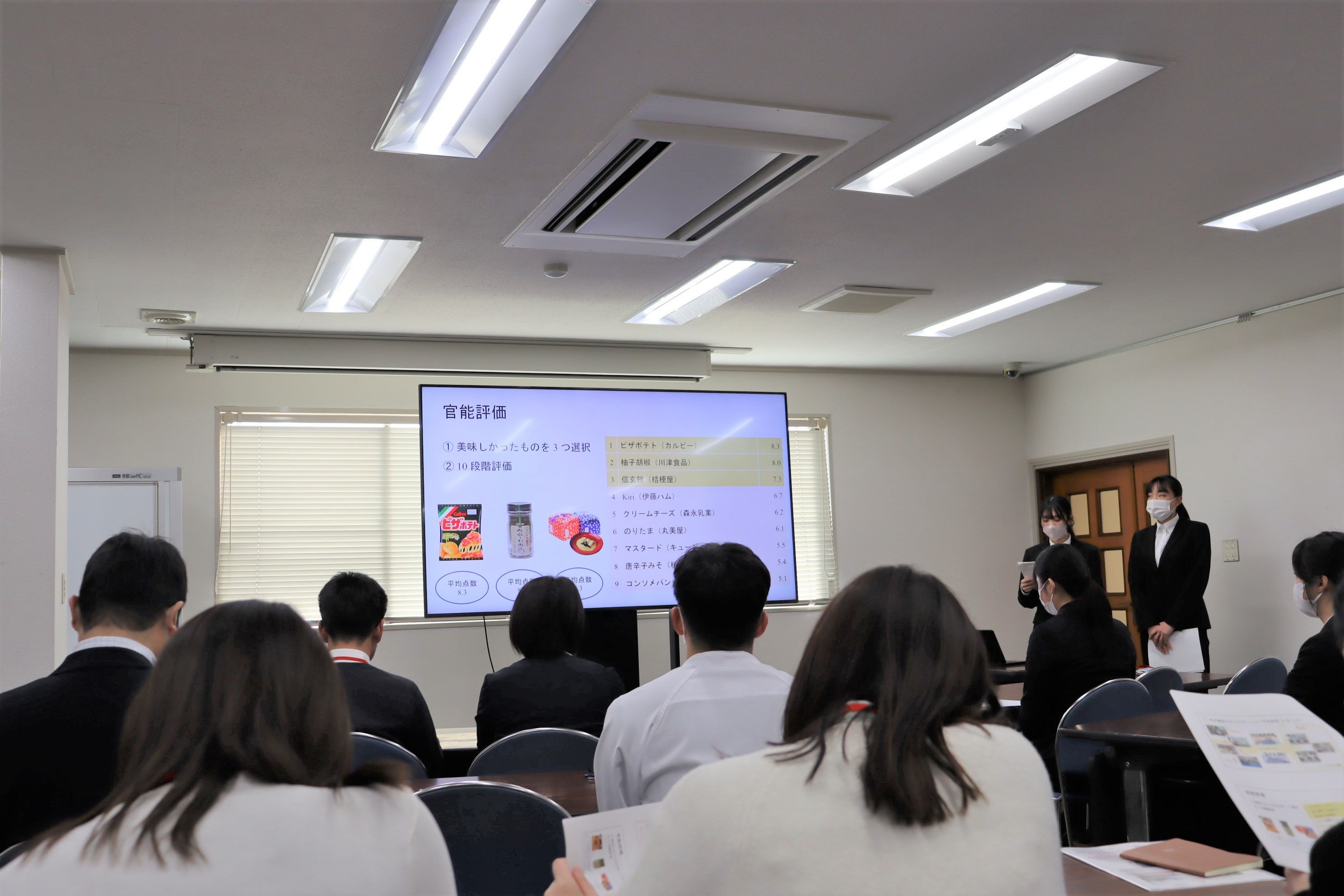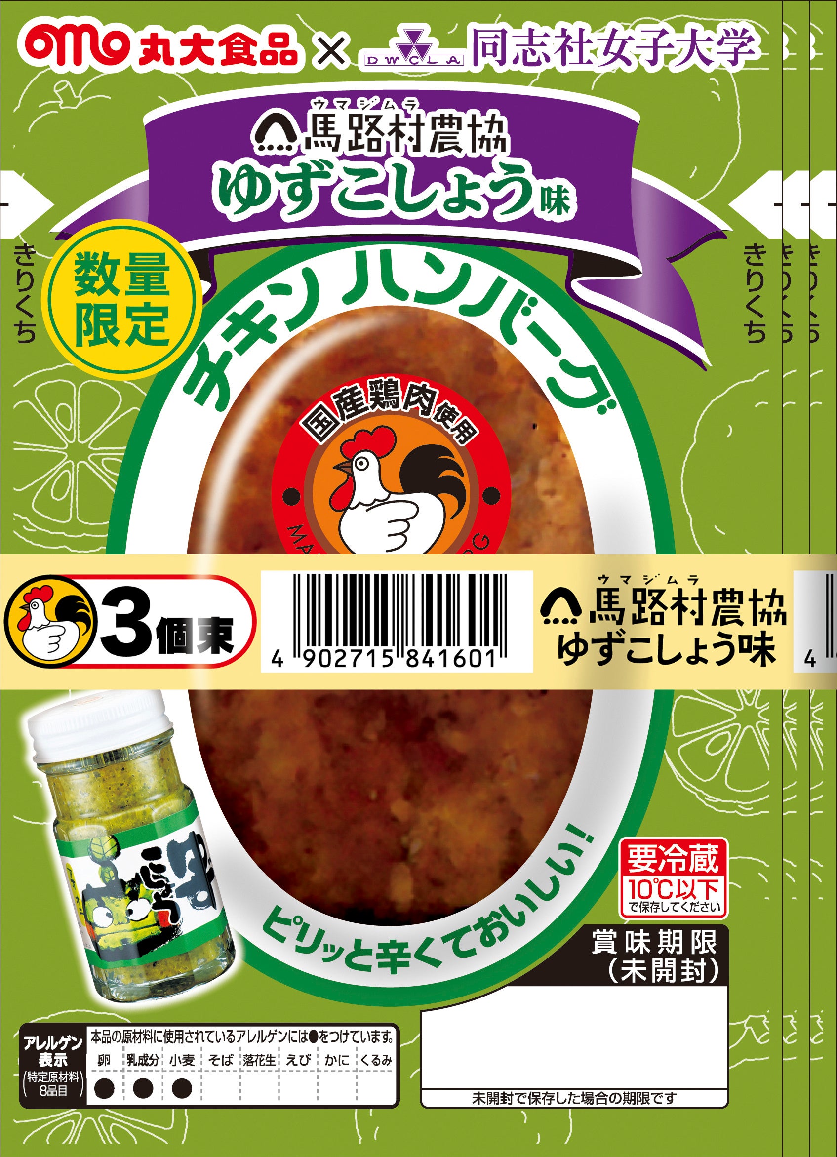 同志社女子大学食物栄養科学科食物科学専攻では、2021年4月に「食品開発プロジェクト」を開設し、学修した知識を社会で実践する場として活動しています。当社は、学生の皆さんに商品の企画から生産、発売までの開発過程の面白さ、商品化の達成感を味わってほしいという思いから、開設当時から同プロジェクトに参加しております。今年度は『女子大生が選ぶ最強コラボ』をテーマとして提示し、同プロジェクトの参加学生と共にチキンハンバーグに合う味付けやパッケージデザイン、販売促進方法などを検討し、「チキンハンバーグ ゆずこしょう味」の商品化に至りました。