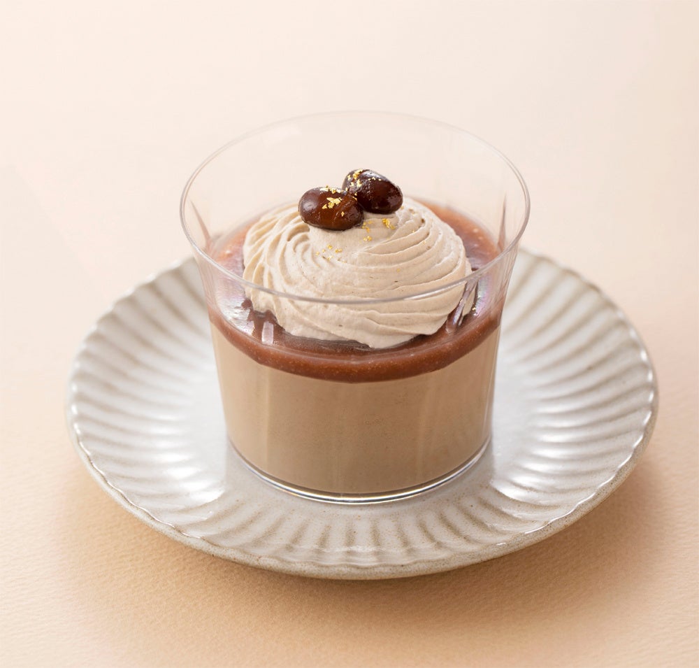 ほうじ茶プリン、羊羹の2層にほうじ茶入りクリームを絞り、飾りつけに北海道産小豆のかのこと、金粉をトッピング。鼻腔をくすぐるこうばしい香りのほうじ茶プリンと優しい甘さの羊羹が絶妙な美味しさです。