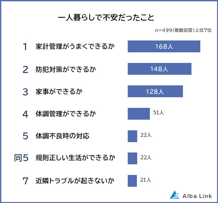 株式会社AlbaLink(本社:東京都江東区、代表取締役:河田 憲二)は、一人暮らし経験者499人を対象に「一人暮らしで不安なこと・楽しいことに関する意識調査」を実施し、そのデータをランキングにしました。