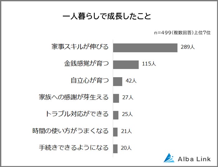最後に「一人暮らしで成長したこと」を聞いたところ、圧倒的1位は「家事スキルが伸びる(289人)」で、全体の6割近くにのぼりました。2位「金銭感覚が育つ(115人)」も100人以上から票を集めています。