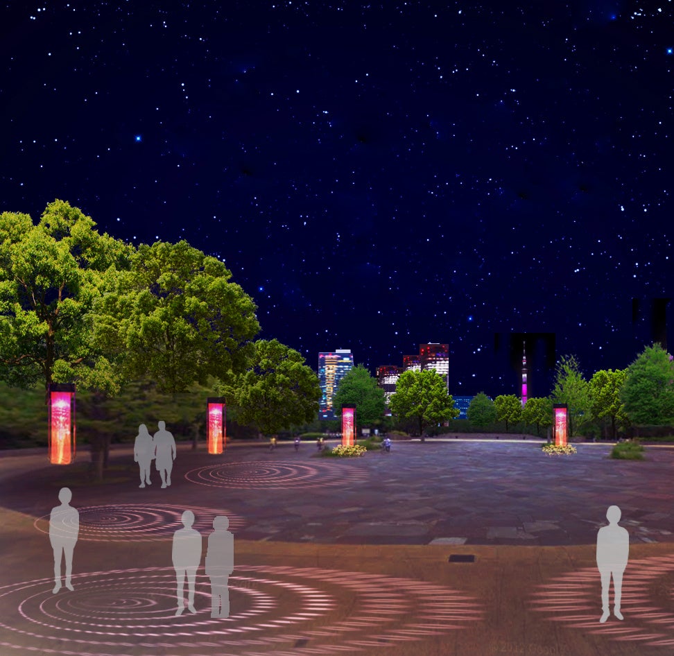 春の訪れを感じさせる春風や桜吹雪をイメージした小さな光が舞い踊る光の体験演出を行います。地面に映し出される模様が「春の息吹」を引き立て、イベント広場全体で春を表現します。一足先に春を体感してみてください。