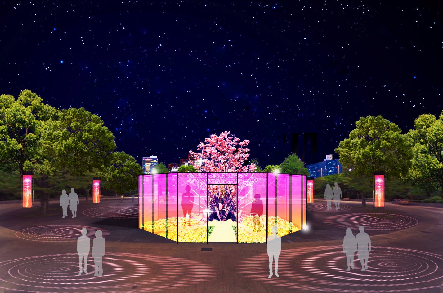 イベント広場中央には、春の息吹を表現する光の立体花壇が登場します。八角形の花壇はグラスオーガンジーの幕で囲まれており、幕の内側には 春の庭が広がり、自由に散策することができます。庭の中心には河津桜、啓翁桜、八重桜を週替わりで生けるシンボリックオブジェも登場。グラスオーガンジーと春を感じさせる植物が織りなす柔らかな春の空間をお楽しみいただけます。