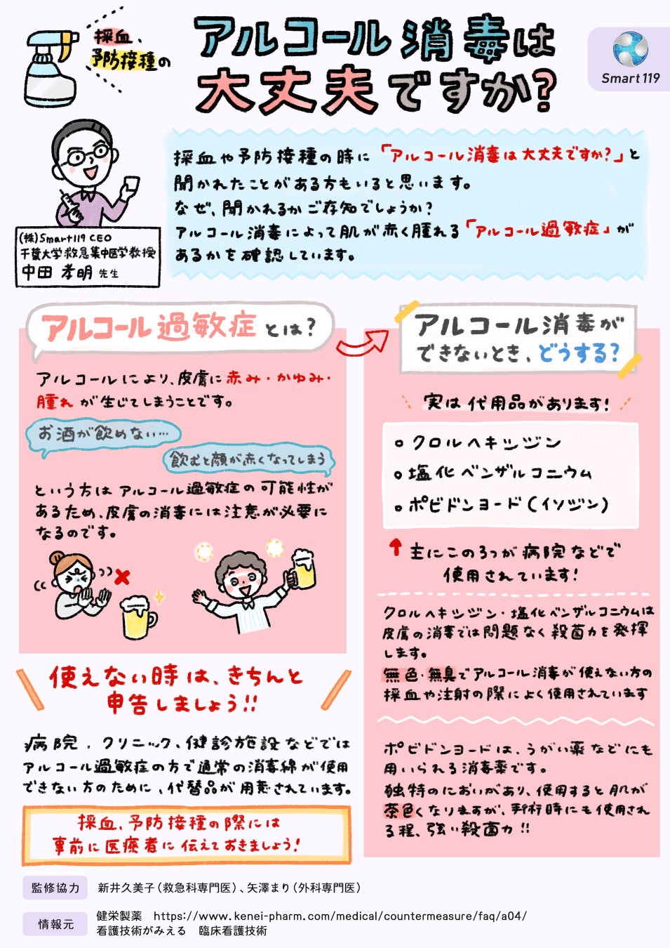 千葉大学発医療スタートアップ企業である株式会社Smart119(本社:千葉県千葉市、代表取締役社長/CEO:中田孝明)は、アルコール消毒についてのイラストレーションを、本日一般公開しました。予防接種、採血の時にはアルコールで皮膚消毒をする際に「アルコール消毒は大丈夫ですか?」と聞かれた経験があると思います。アルコールで消毒をする理由は、注射部位の皮膚の汚れを取り除き、血行性感染を防ぐためです。ただ、皮膚に赤みやかぶれ、もしくは腫れを生じる「アルコール過敏症」を持つ人もいることから、こうして確認をします。過敏症での場合は、ノンアルコール消毒液で代用されます。救急集中治療医の見地から、アルコール過敏症の方が安心して予防接種を受けられるように、親しみやすいマンガで解説します。本資料は学校、企業、公共機関、町内会等で自由に配布・利用していただくことが可能です。