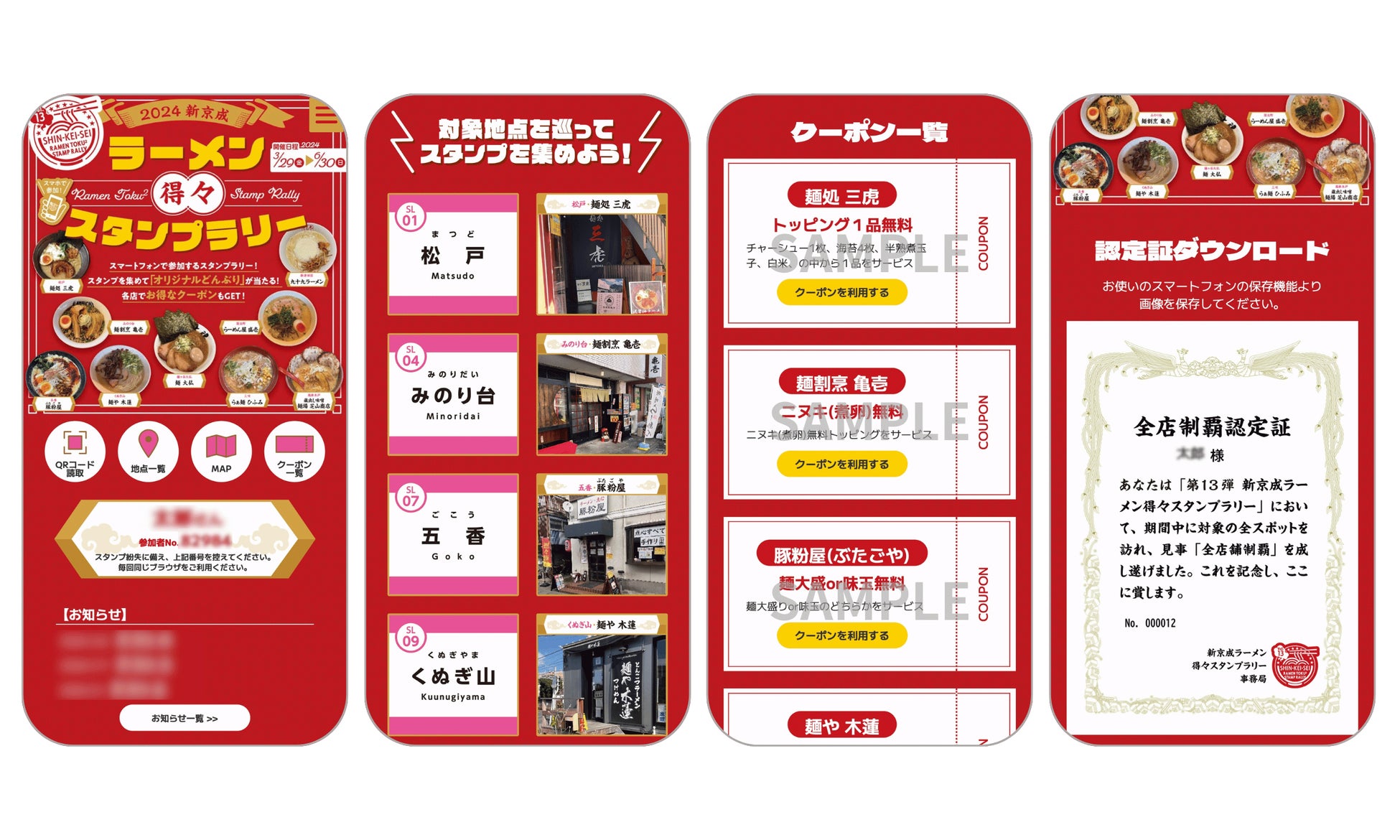 参加者は実施期間中に対象の駅やラーメン店を巡り、各所に設置されている地点ポスターからQRコードを読み取ることでスタンプを取得します。ラーメン店でスタンプを取得すると、「トッピング一品無料」や「麺大盛無料」など、その店の独自の特典クーポンもあわせて獲得できます。