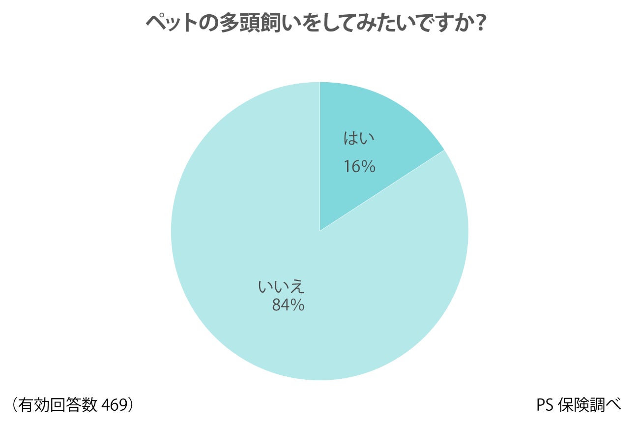 現在は多頭飼いをしていない飼い主に多頭飼いへの関心を伺ったところ、「はい」と回答した人は16%となり、少数派であることがわかりました。