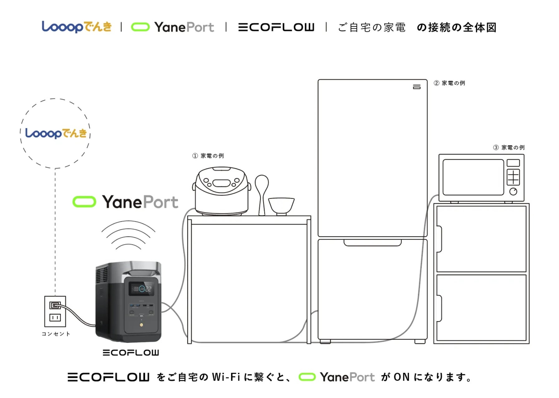 そこでこの度、太陽光発電の恵みをユーザーに還元できる市場連動型の電気料金プラン「スマートタイムONE」で、独立系新電力会社※1として低圧部門で電力供給実績No.1※2のLooop、ポータブル電源市場で業界トップクラスの実績をもつEcoFlow、分散型電源のエネルギーマネジメントを強みとするYanekaraの3社の協業により、業界初となる「市場連動型」充放電サービス「YanePort」と連携したポータブル電源が実現し、その実証販売がスタートしました。※1 他社資本子会社ではない形で起業された新電力事業者 ※2 経済産業省資源エネルギー庁「電力調査統計>電力需要実績>低圧計」より自社集計