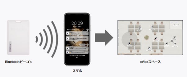 また、リアルオフィスに出社勤務する社員の位置情報を、oVice Goとリアルオフィスに設置したビーコンを連携させることで取得し、バーチャル空間「oVice」上にアバターとして表出させる機能を、本日開催した「oVice Summit 2022」で発表しました。リモートワークと出社勤務が混在するハイブリッドワークにおいて、これまでリモート側から見ることが難しかったリアルオフィスの人の動きを可視化し、双方が常時自然につながる環境を構築します。モバイルアプリとビーコンを連携した位置情報連携機能は、今後、ユーザーと共に実証を重ね、サービス化を目指します。