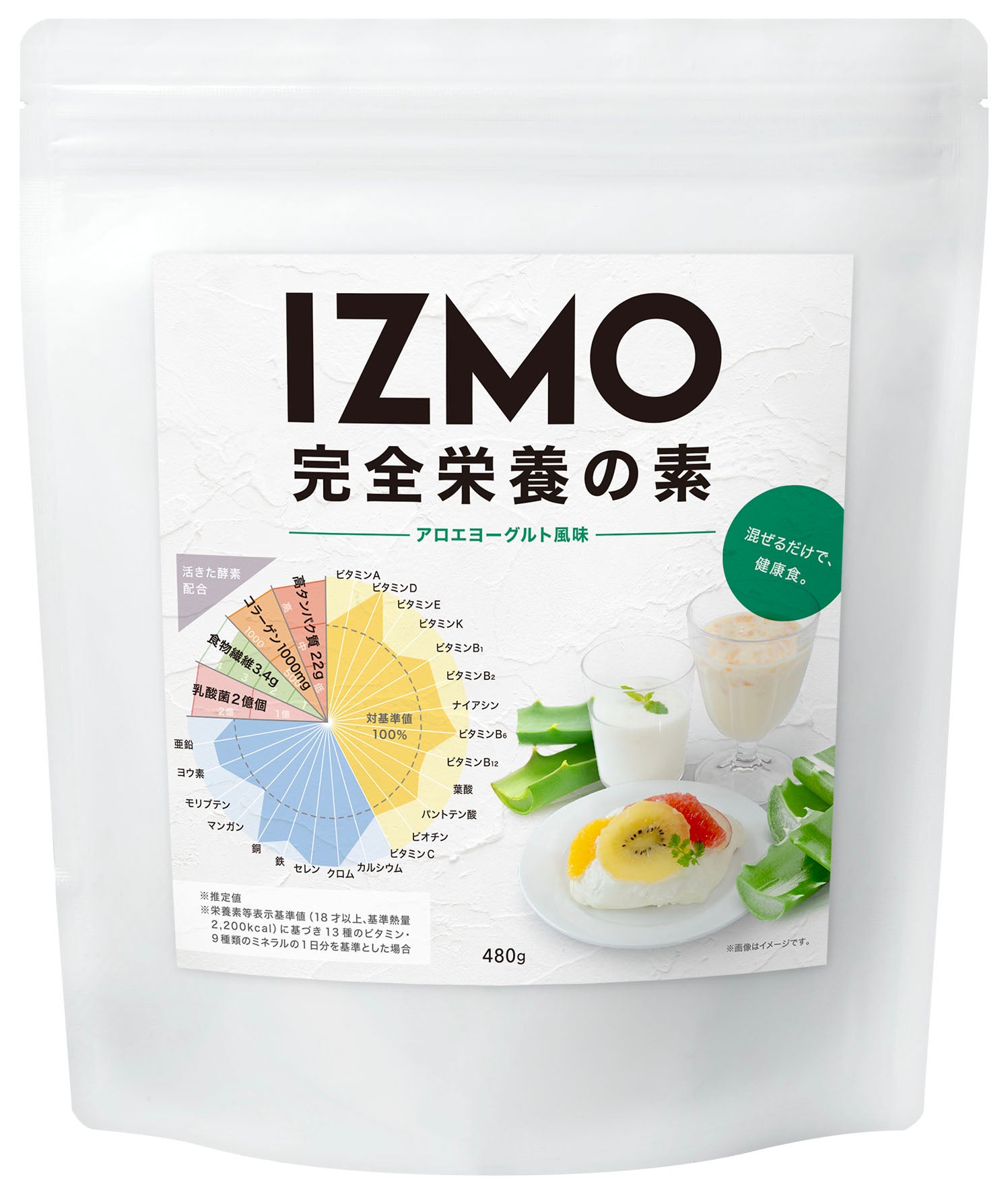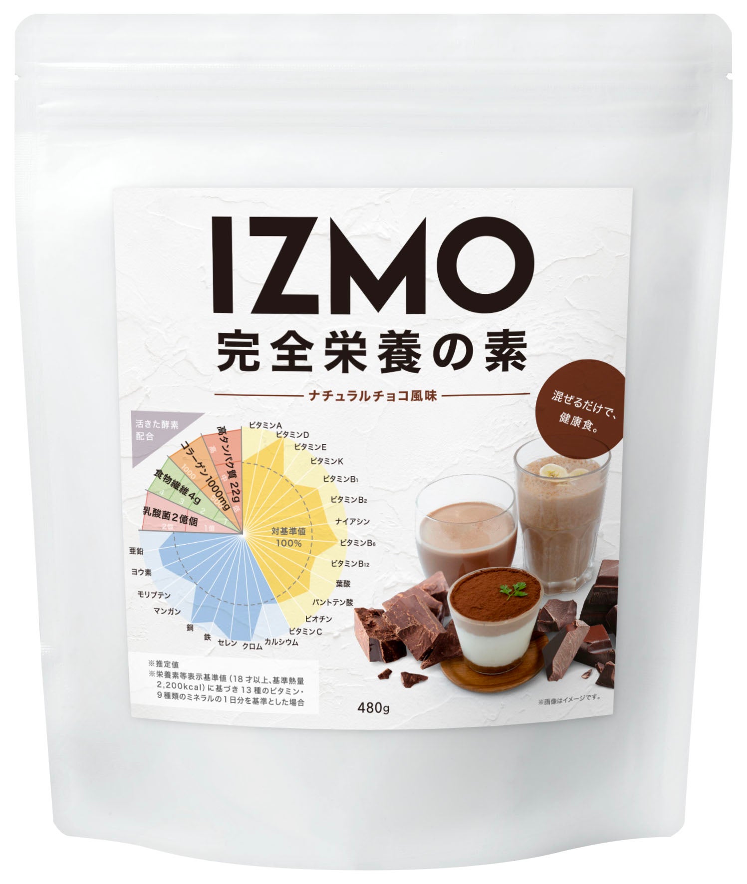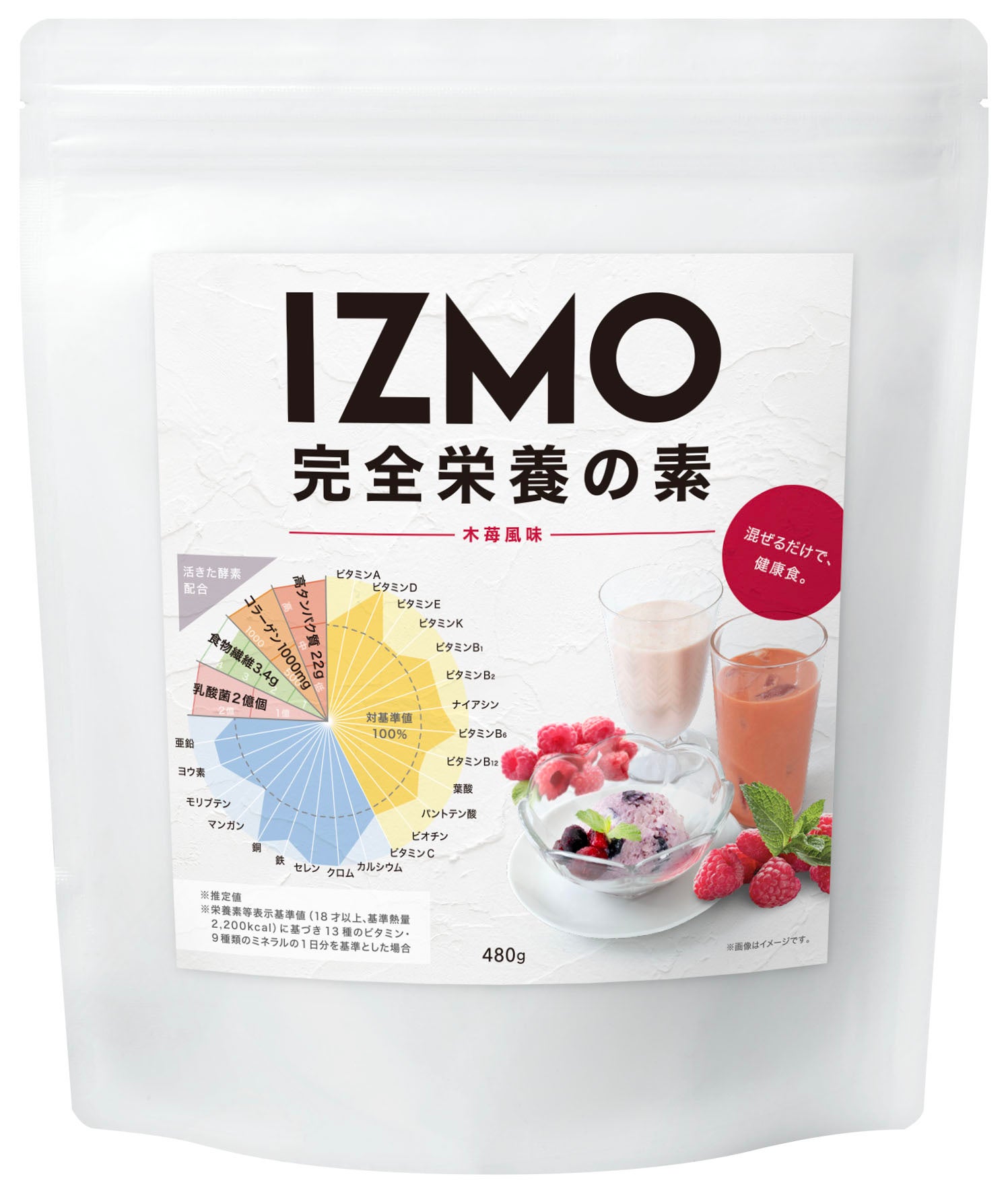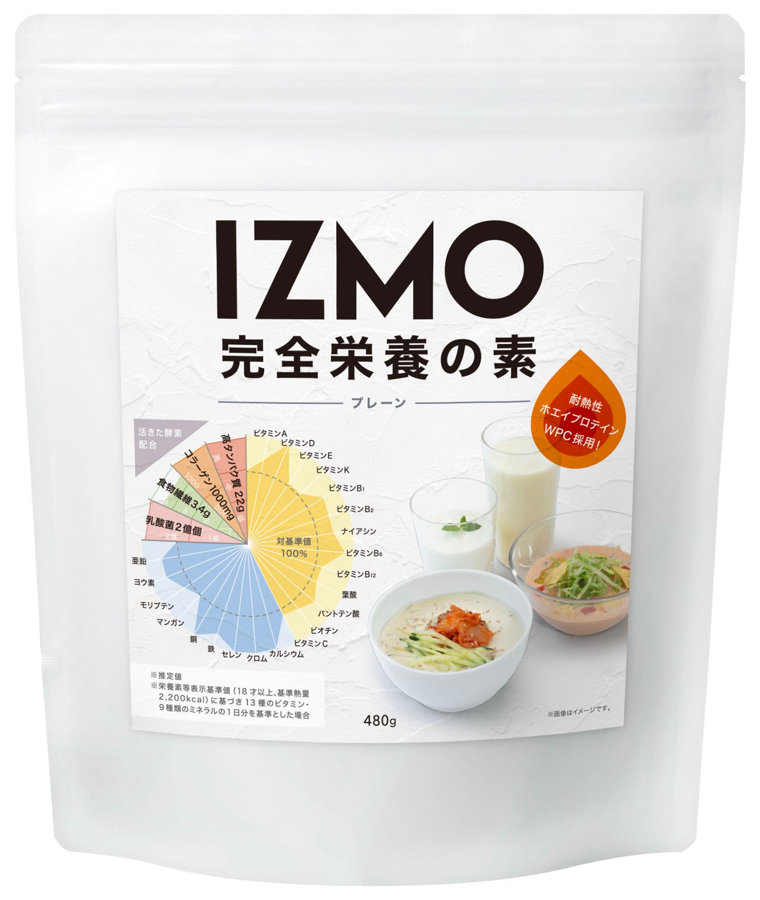 『IZMO 完全栄養の素』は、1食分40gの中に、1日に必要な量のタンパク質、13種類のビタミンと9種類のミネラル、活きた酵素を含有し、さらに、コラーゲン、食物繊維、乳酸菌を摂取することができます。