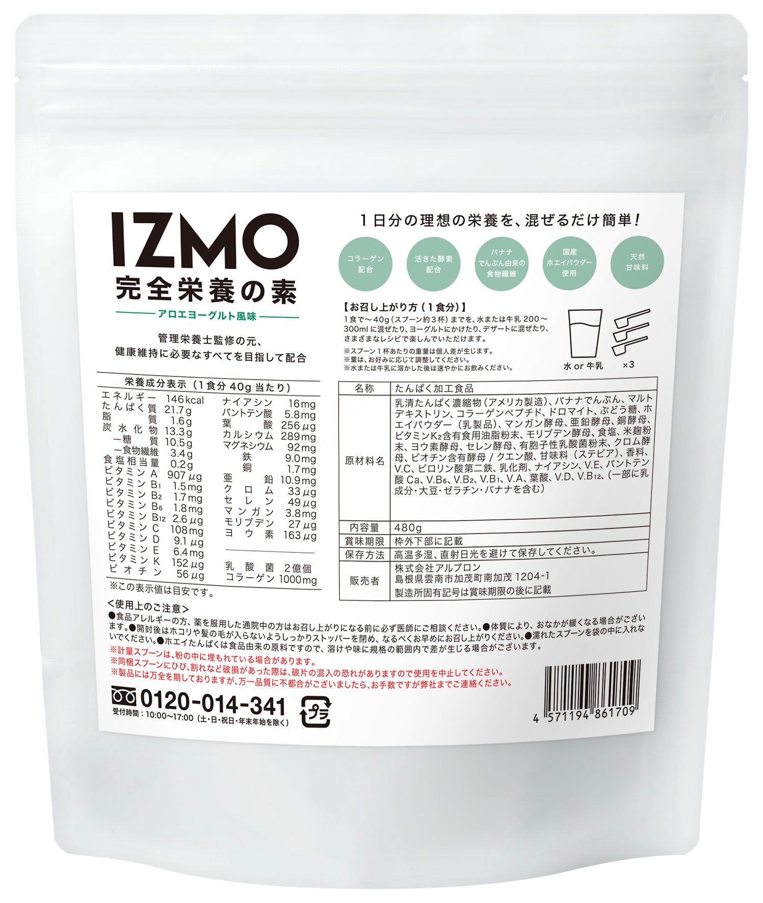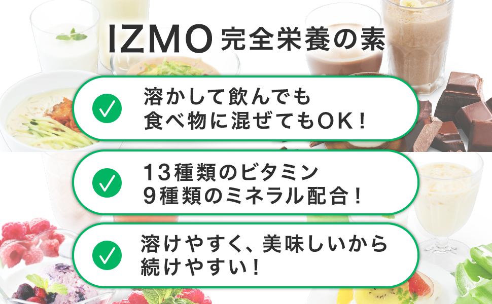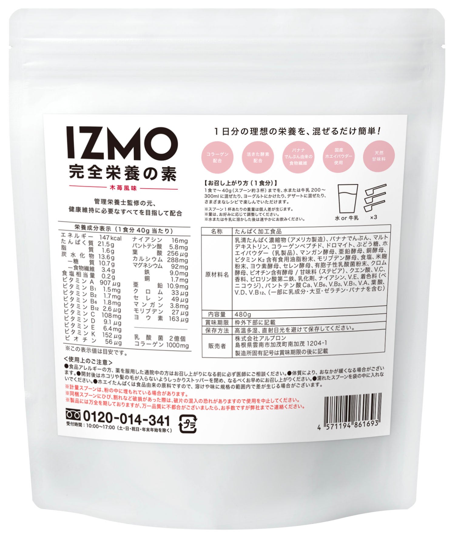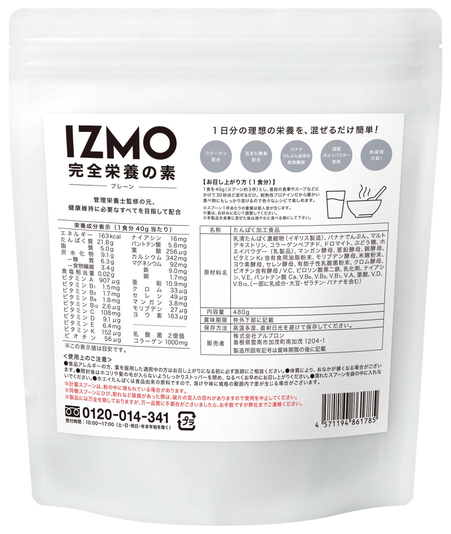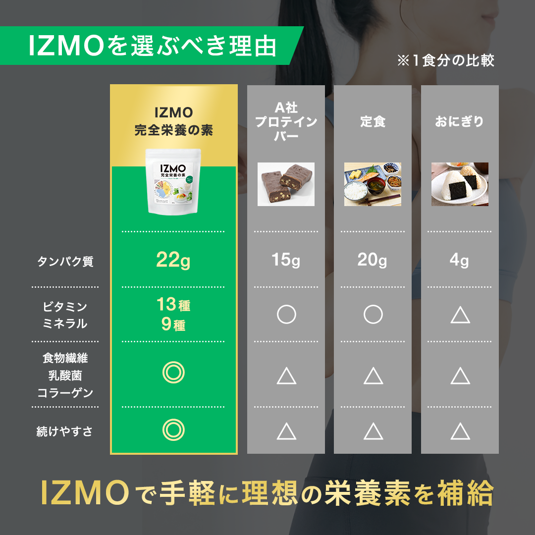 『IZMO 完全栄養の素』は、1食分40gの中に、1日に必要な量のタンパク質、13種類のビタミンと9種類のミネラル、活きた酵素を含有し、さらに、コラーゲン、食物繊維、乳酸菌を摂取することができます。