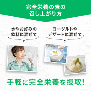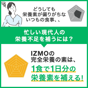 アンバランスな食事しか食べられないときや、十分に食事が摂れないときでも、『IZMO 完全栄養の素』をならば、1日に必要な栄養素を補充できます。