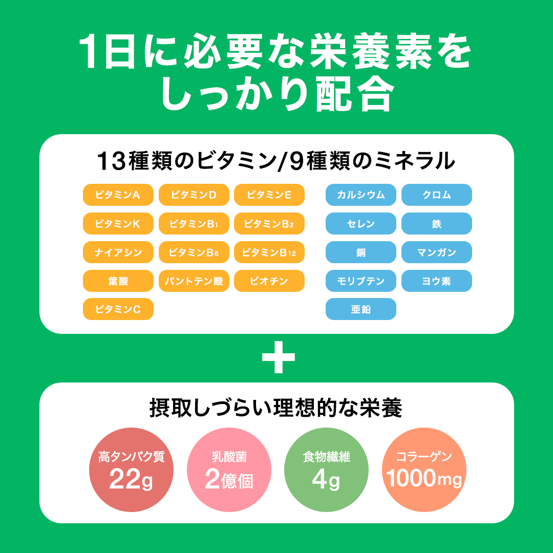原材料名/分離大豆たんぱく(脱脂大豆、植物油脂)(国内製造)、乳清たんぱく濃縮物、バナナでんぷん、マルトデキストリン、ココアパウダー、コラーゲンペプチド、ドロマイト、ぶどう糖、ホエイパウダー(乳製品)、マンガン酵母、亜鉛酵母、銅酵母、ビタミンK2含有食用油脂粉末、食塩、モリブデン酵母、米麹粉末、ヨウ素酵母、セレン酵母、有胞子性乳酸菌粉末、クロム酵母、ビオチン含有酵母/甘味料(ステビア)、V.C、乳化剤、ピロリン酸第二鉄、香料、ナイアシン、V.E、パントテン酸Ca、V.B6、V.B2、V.B1、V.A、葉酸、V.D、V.B12、(一部に乳成分・大豆・ゼラチン・バナナを含む)