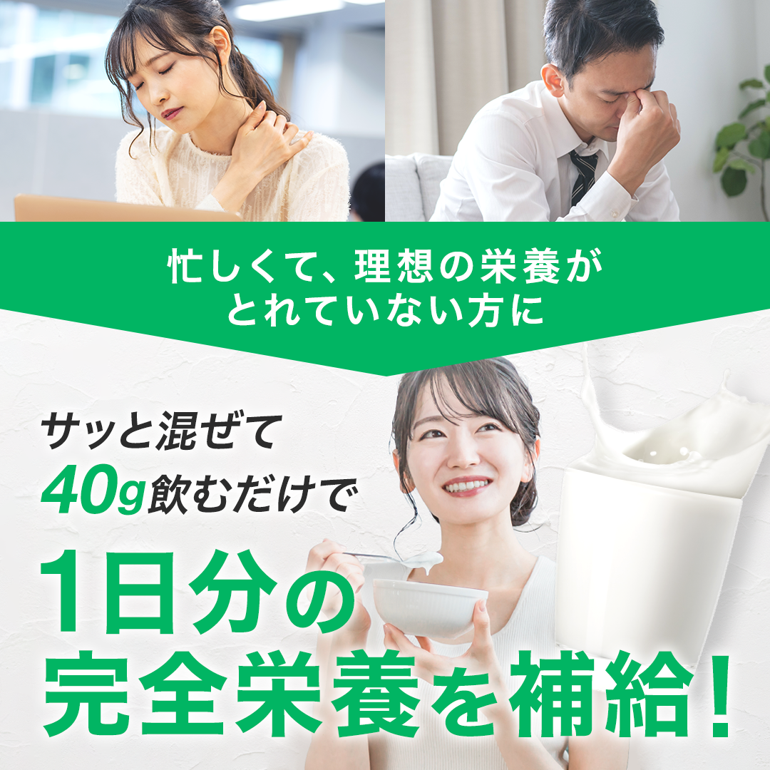 今回の商品は、忙しい日本人の食生活の乱れやバランスの悪い食事による、栄養摂取の問題を解決すべく企画・開発しました。1食分40gで、1日に必要なタンパク質、ビタミン、ミネラル、乳酸菌、食物繊維などを摂取することができます。これは、未来のライフスタイルを先取りした食事の姿でもあります。