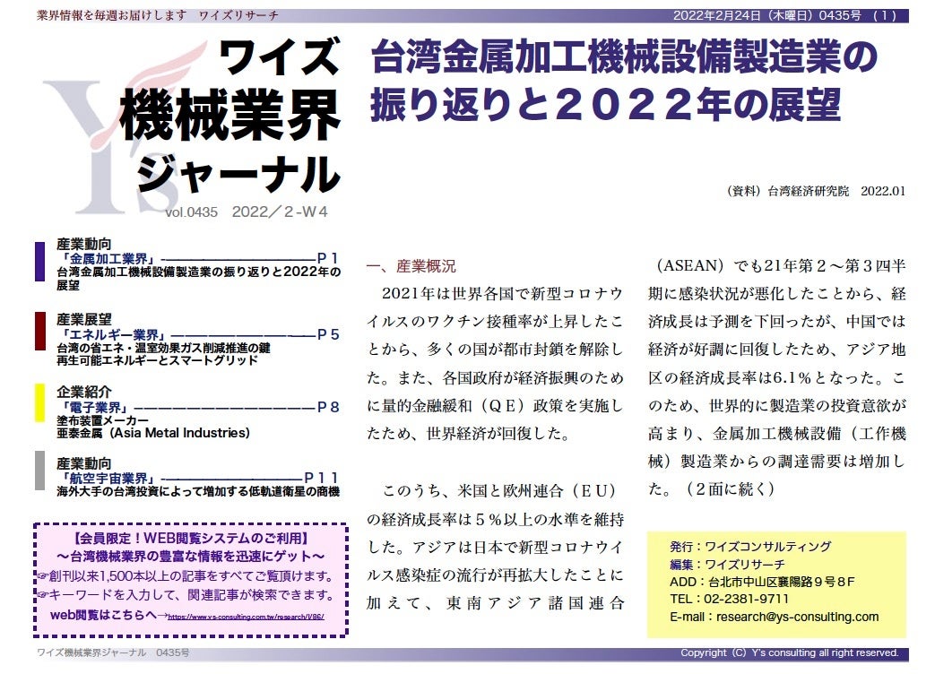 台湾金属加工機械設備製造業の振り返りと2022年の展望<ワイズ機械業界ジャーナル2022年2月第4週号発行>