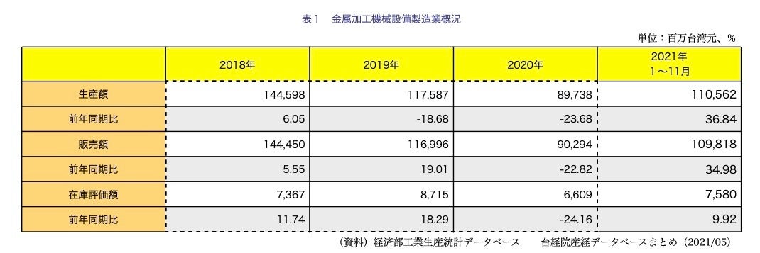 このように、海外および台湾市場の需要が回復した一方、比較水準の昨年数値が低いことから、21年1〜11月の台湾工作機械産業の生産額は前年同期比 36.84%増の1,105億6,200万台湾元、販売額は同34.98%増の1,098億1,800万台湾元といずれも大幅成長した。