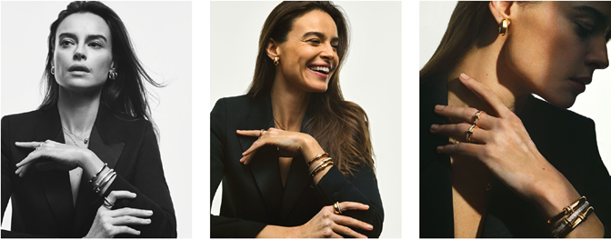 力強く自信に満ちたカシア・スムトゥニアクは、ローズゴールドにダイヤモンドがあしらわれた「イコニカ」コレクションのミニマルなバングルとリングを身に着け、印象的なエレガンスを表しています。また、ダイヤモンドとフェアマインドホワイトゴールドの新作「ヌード ソリテール」 ペンダントとリングが、モノクロで映し出す彼女のルックを輝かせています。