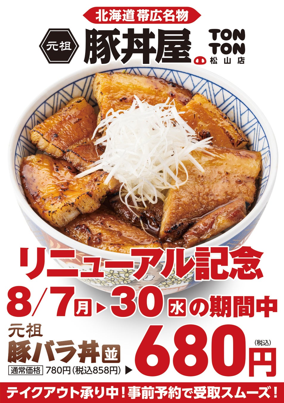 松山店のリニューアルを記念して、8/7(月)〜30(水)の期間中、当店自慢の「豚バラ丼〈並〉」を特別価格680円(税込)にて提供いたします。