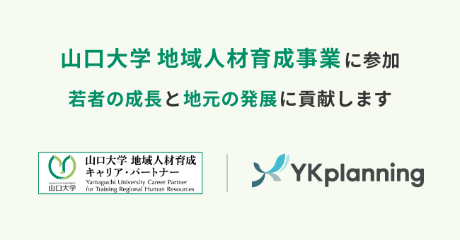 株式会社YKプランニング(本社:山口県防府市、代表取締役:岡本 辰徳)は、山口県内企業(キャリアパートナー企業)並びに県内各地域と連携し、地域に根差した実践的な教育・企画等を通じて、山口の未来をリードする若者の育成と地元への定着を推進することを目的とした山口大学独自の事業に参加いたします。