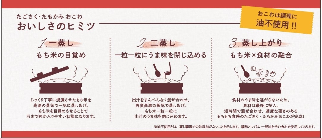 厳選した国産もち米と海の幸・山の幸などの旬の食材を店内のせいろでじっくり蒸しあげたおこわは、伝統や四季を大切にしながら、日常のシーンでも広く親しまれてきた「たごさく」ならではの逸品です。