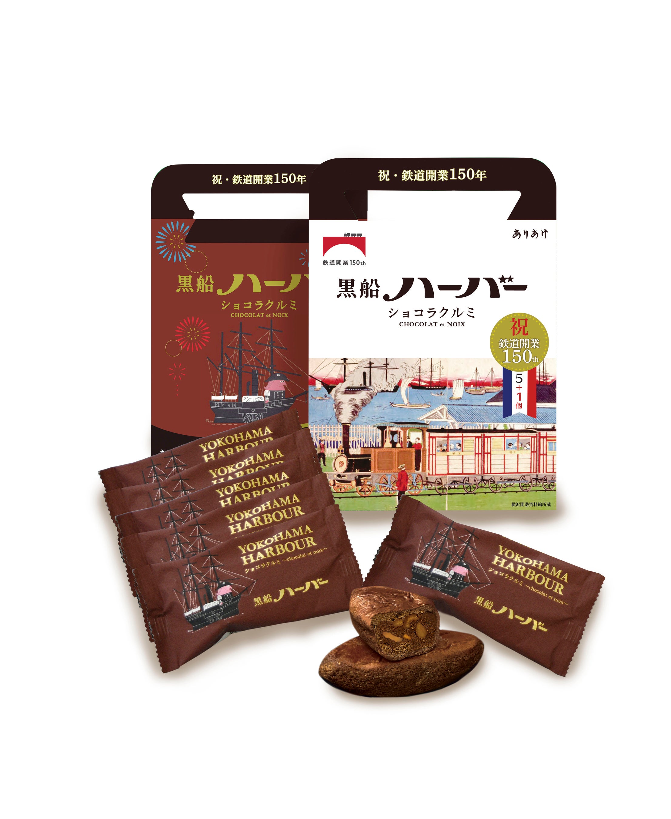 横浜開港資料館所蔵の錦絵の画像が使用された「鉄道開業 150年 記念仕様 黒船ハーバーショコラクルミ 5+1個」