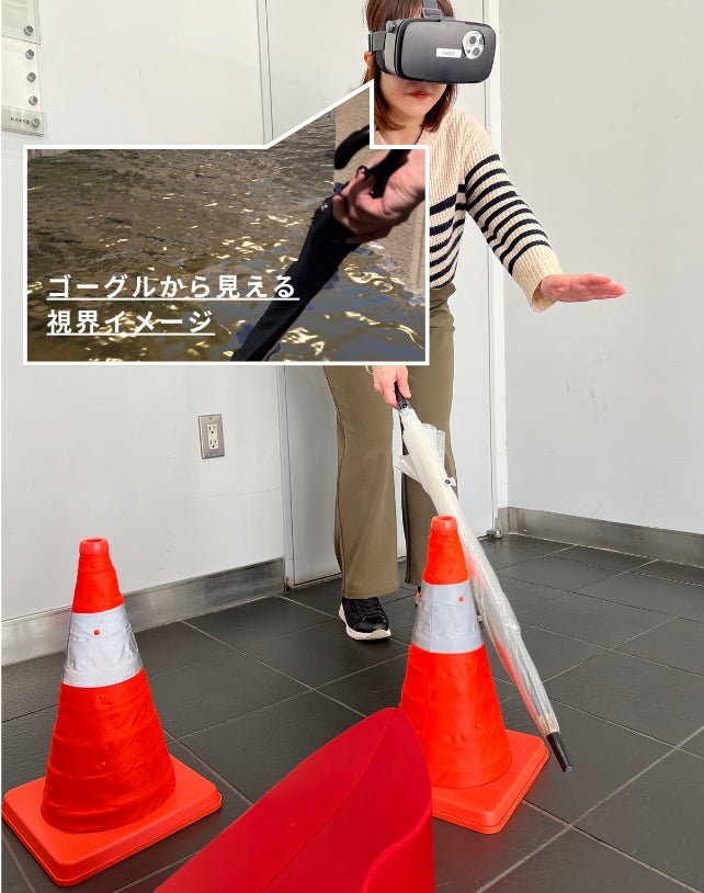 専用アプリを入れたスマートフォンとゴーグルを使用し、リアルな浸水体験を行うことができます。今自分がいる場所にCGの水を重ね、没入感がありリアルな災害体験が可能です。