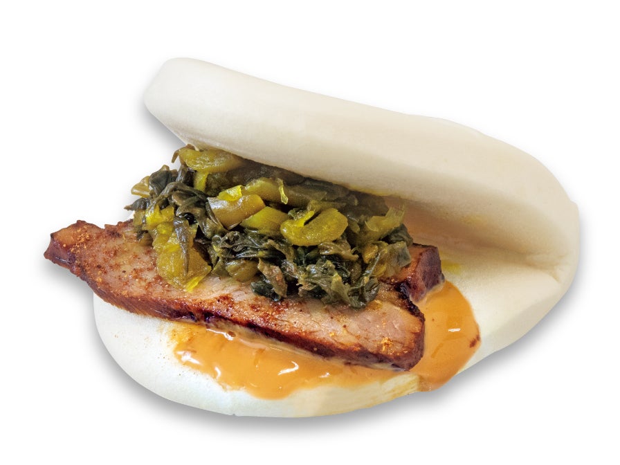 蒸しパンに豚肉、ピーナッツペースト、高菜をサンドしました。