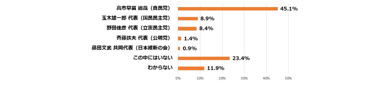 政策実行能力やリーダーシップなどを総合的に考えたとき、首相として期待できると思う、党の代表者を一人選んでもらうと、「高市早苗 総裁(自民党)」が45.1%と最も多く、「玉木雄一郎 代表(国民民主党)」8.9%、「野田佳彦 代表(立憲民主党)」8.4%、「斉藤鉄夫 代表(公明党)」1.4%、「藤田文武 共同代表(日本維新の会)」0.9%と続いた。「この中にはいない」は23.4%、「わからない」が11.9%あった。