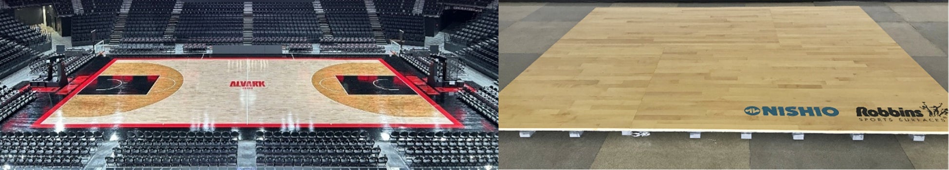 北米プロバスケットボールリーグNBAでNO.1のシェアを誇るロビンス社の仮設木床『オールスタープラス』をご納品させて頂きました。確かな実績と公式認定(FIBA 国際バスケットボール協会)を所持しており、短時間での施工が可能など高い製品特性を持っております。中央から2方向へ同時施工可能で、クッションパッドによる衝撃吸収性があります。
