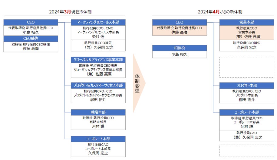 広報・海外事業・政府対応など渉外部分に従事していたCOOの染谷は、引継ぎで出向期間を半年延長していましたが、3月末任期満了で出向復帰するため、4月以降COO業務は新社長の佐藤が引き継ぎます。貿易コンソーシアムの責任者や政府・海外機関・アライアンス先等への渉外窓口も佐藤に変更致します。