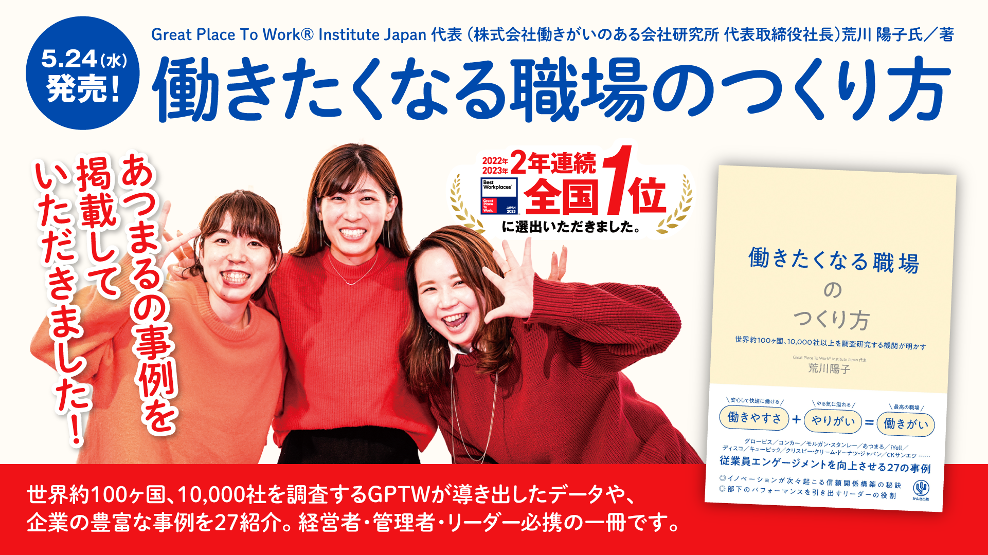 この度、株式会社あつまる(本社:東京都渋谷区、代表取締役社長:石井 陽介)の新卒採用の事例を『働きたくなる職場のつくり方』にてご紹介いただきましたのでご報告申し上げます。