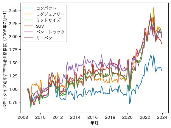 図:ボディタイプ別「中古車市場価格指数」前年同月比