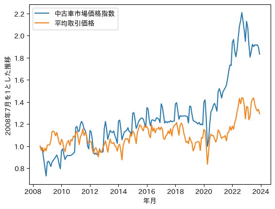図:「中古車市場価格指数」と「平均取引価格」の比較
