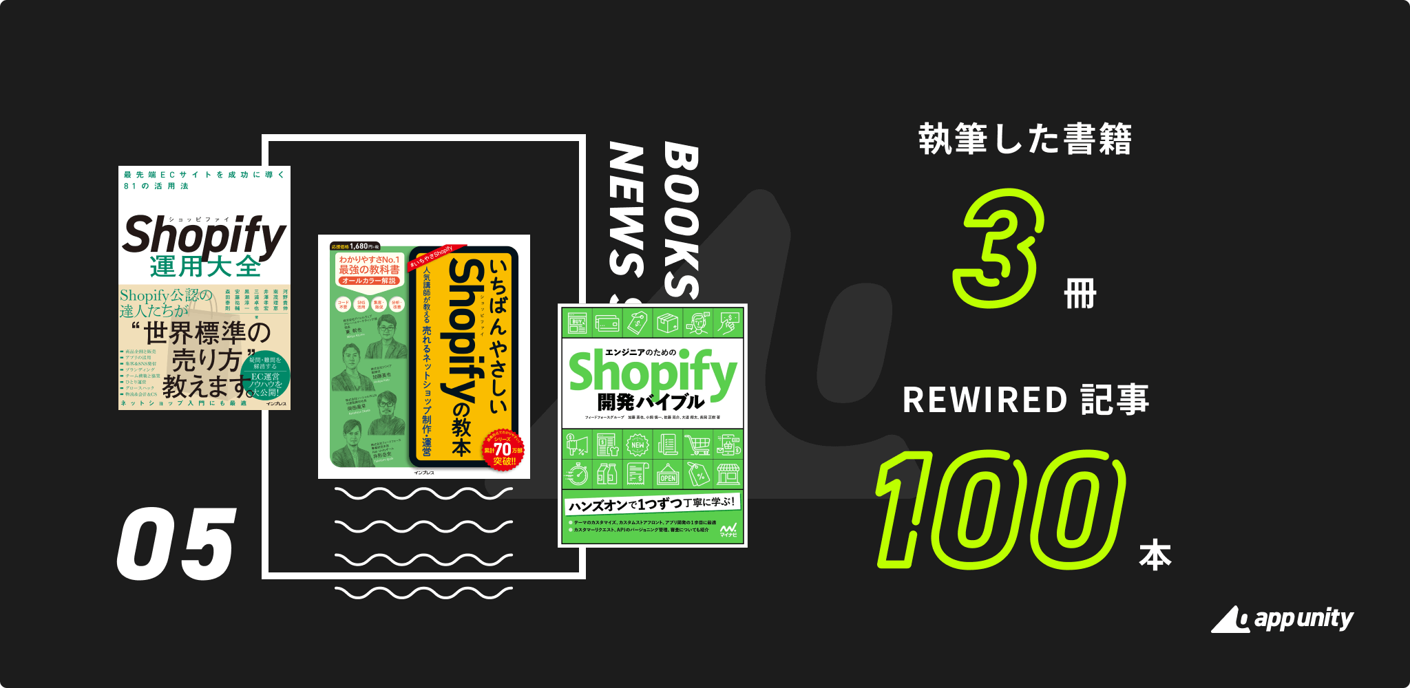 App Unity所属企業の社員が執筆を担当させていただいたShopify関連の書籍は、今年5月に出版されました『エンジニアのためのShopify開発バイブル』を含み、なんと3冊!(※3)