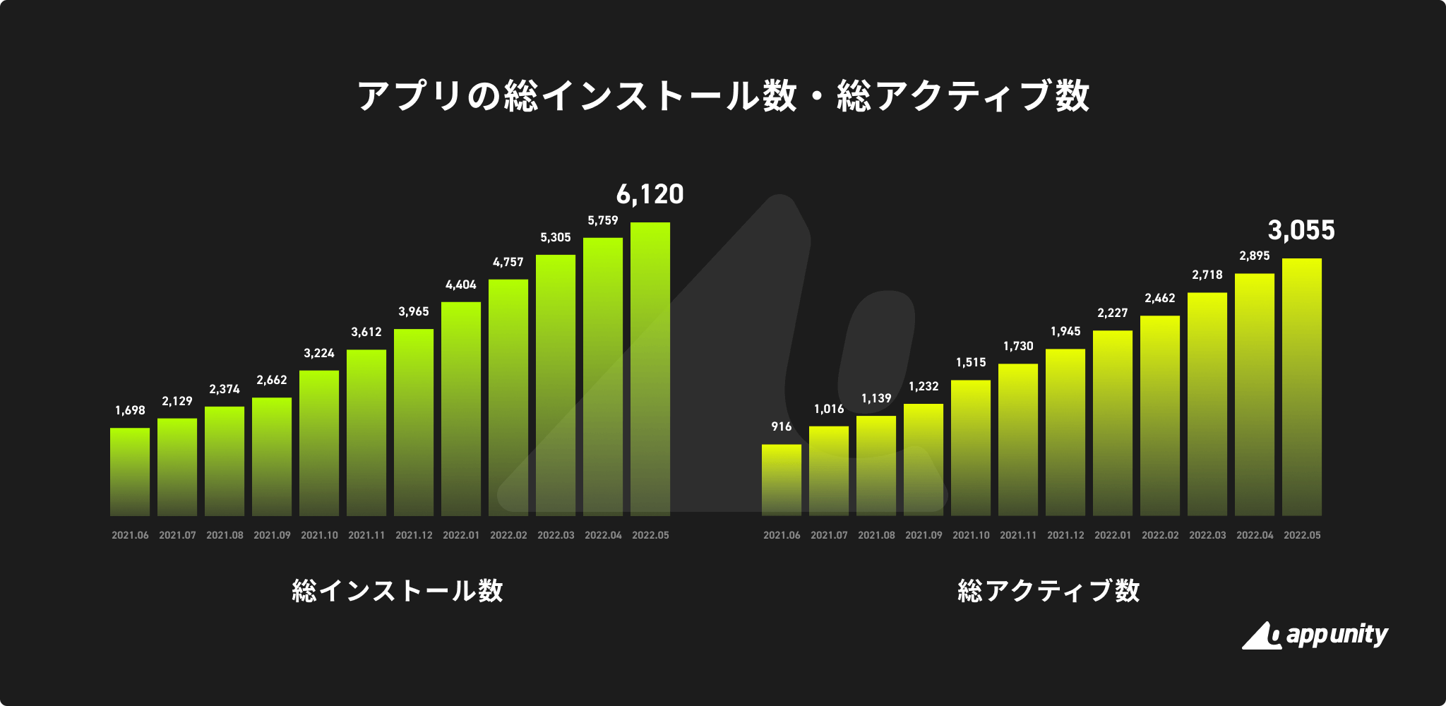 App Unityに参画いただいた「アプリの総インストール数」は順調に右肩上がりで伸ばすことができました。また、実際にご利用いただいている「アプリの総アクティブ数」も順調に伸び、継続的にご利用いただいているマーチャント(事業者)さんの数も非常に大きなものとなりました。(集計期間:2021年6月~2022年5月末)