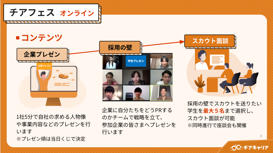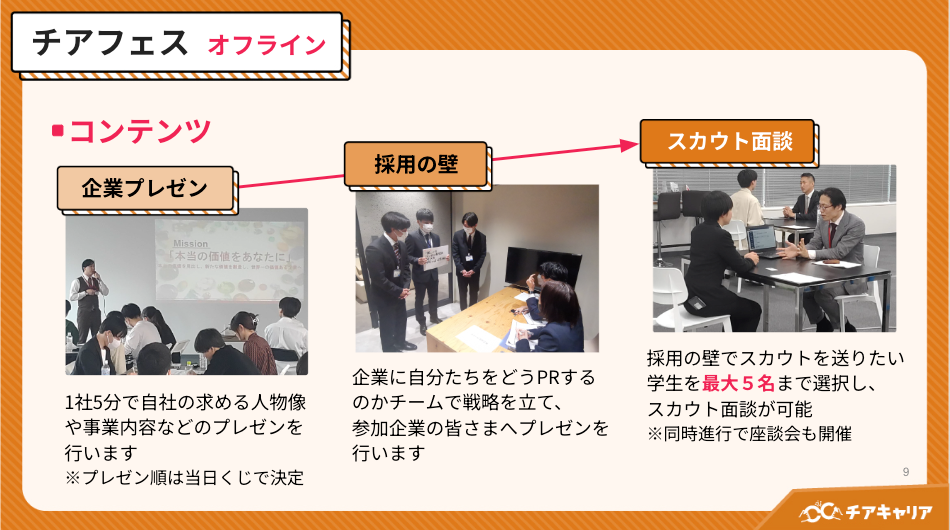 そんな意欲的な学生に対し企業プレゼン、ビジネスゲーム、グループワーク、スカウト面談などを通じて、学生の本音やスキルを見定めやすい企画設計になっており企業側からも、学生側からも、積極的にアプローチすることができるイベントです。