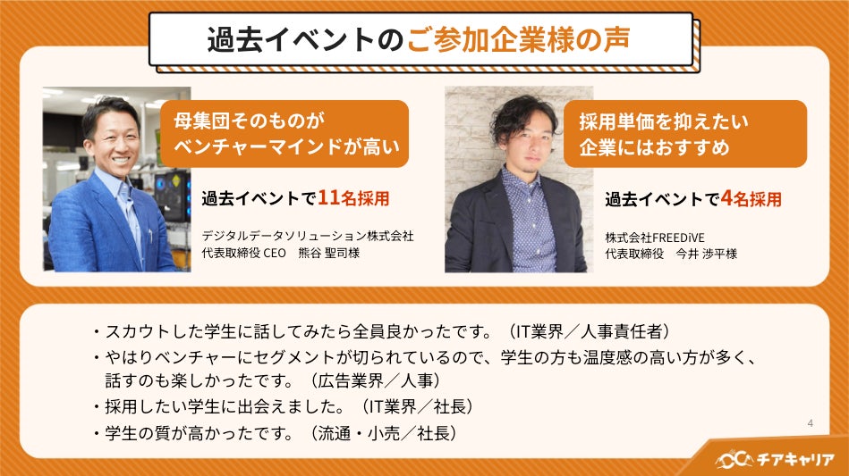 チアキャリアの登録学生はベンチャーマインド(成長志向、自発性)の高い学生が多く、母集団の質にとても満足しています。特に、情熱フェスタでは当社のターゲットである上位校の学生も多く参加しています。彼らを直接口説ける場としても重宝しています。