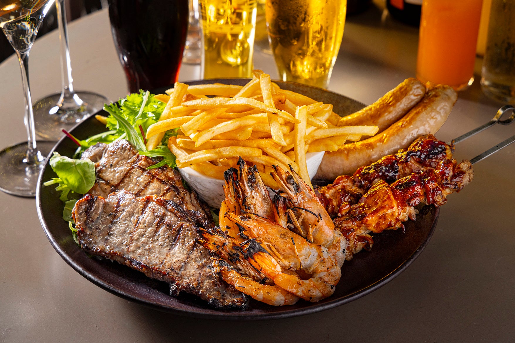 冷えたプレミアムビールをはじめ、赤・白・ロゼの3種のワイン、スパークリングワイン(プレミアムプラン限定)など幅広いドリンクが飲み放題。料理はシェフこだわりのグリルメニューを中心に、季節のサラダ、オーストラリア産サーロインのグリル、BBQチキン、ケイジャンプラウン、ジャンボソーセージ、フレンチフライ、ニューヨークチーズケーキをご用意。味もボリュームも満足度の高いラインナップです。