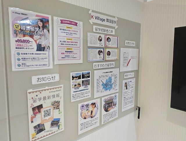池袋東口校では、K Village韓国留学の紹介スペースも用意し現地への短期・長期留学もサポートしています。