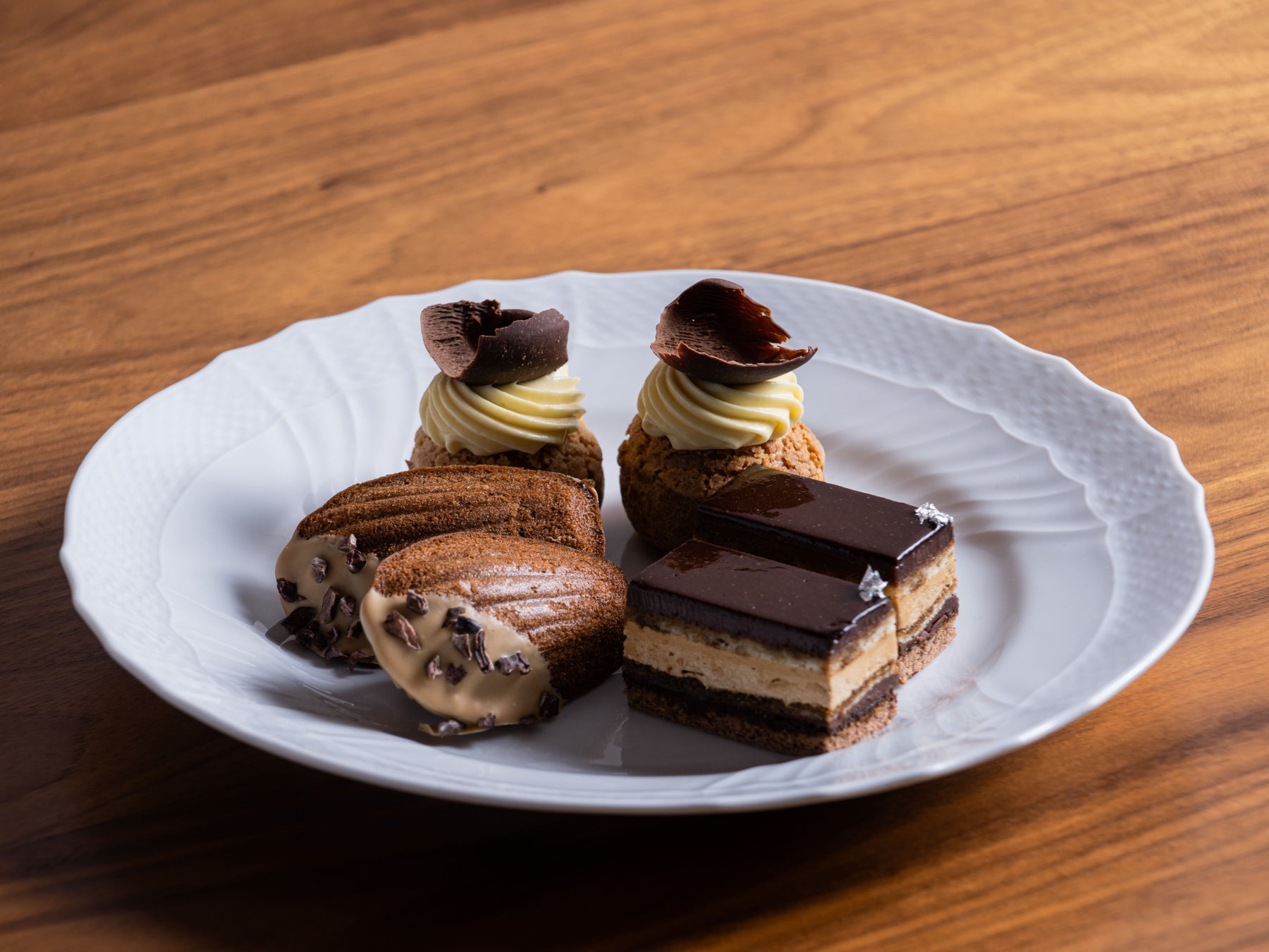 カカオとダージリンティーの香りがふんわりと香るマドレーヌにはブロンドチョコレートをあしらい、艶っとしたチョコレートが美しいクラシックケーキ、ガトーオペラは甘さ控えめに仕上げています。