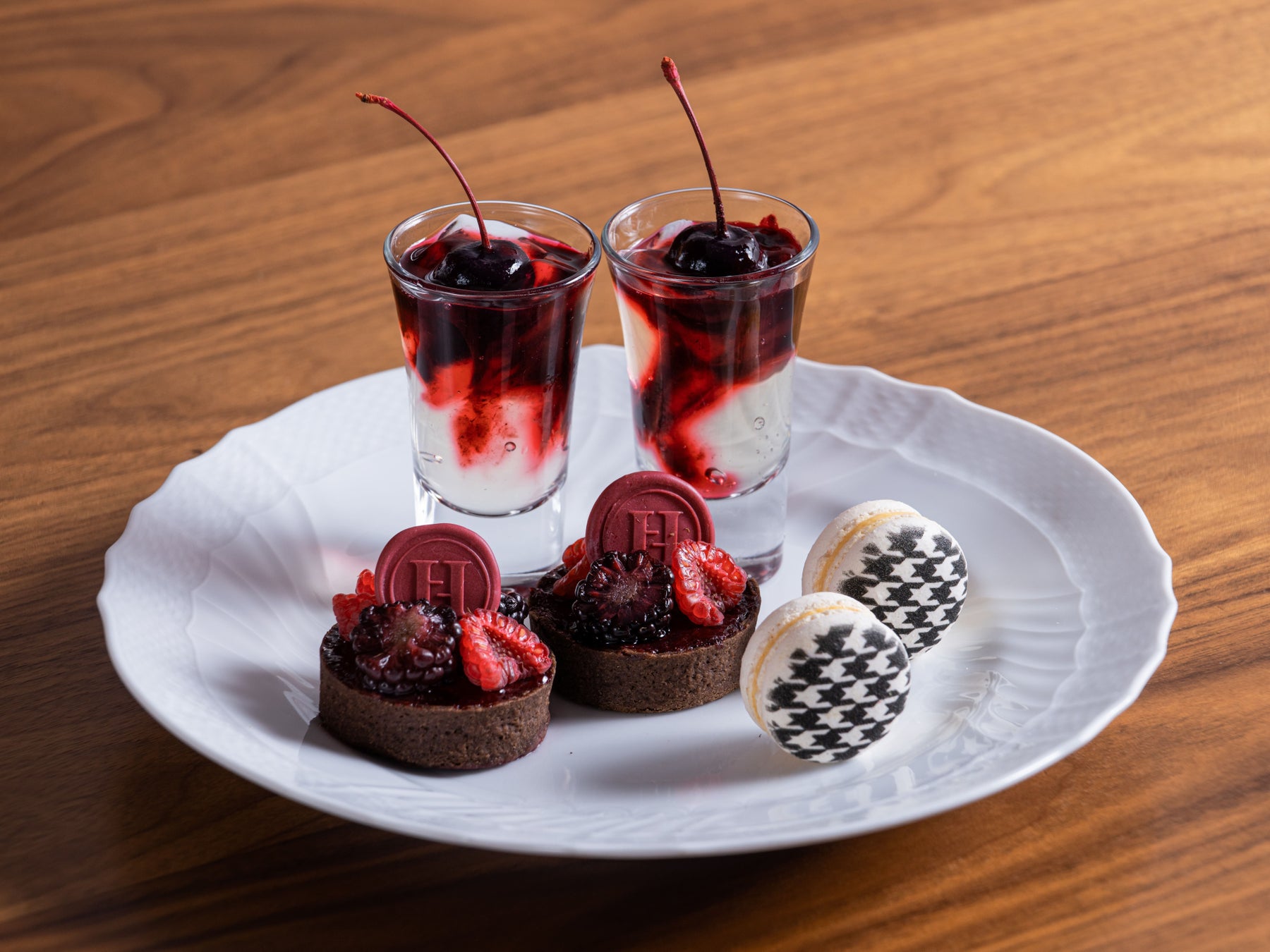 上段は、さっぱりとしたスパークリングワインのジュレに華やかなダークレッドのカシスとチェリーでホリデーらしさを演出。バニラフレーバーのマカロンには今年らしいアクセントとしてアイコニックな千鳥柄を。
