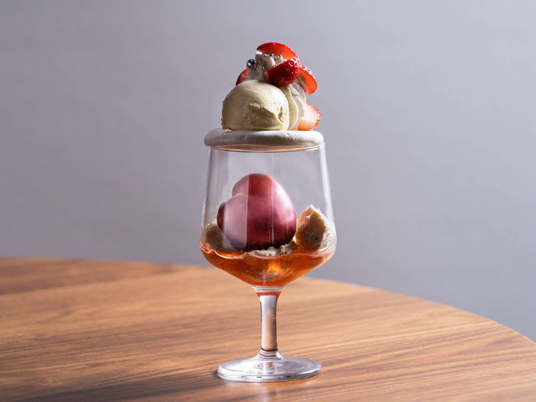 今年のスペシャリテは、グラスの中身とグラスの上部とで2度美味しさを楽しめるパフェに。