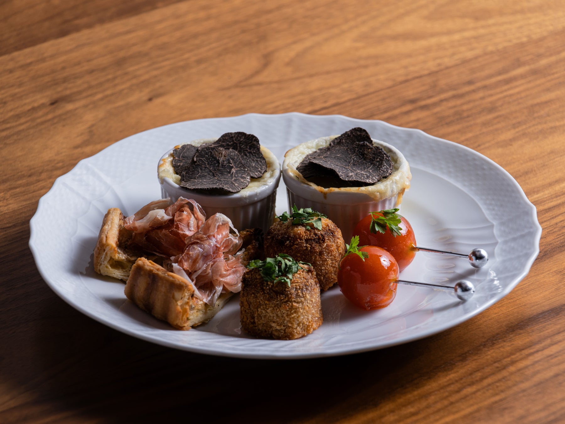 蟹クリームコロッケは濃厚な味わいにフレッシュトマトのソースで少しさっぱり。チェリートマトを艶のある飴のように仕上げたパートドトマトの甘酸っぱさはお口直しにぴったりです。彩り豊かな野菜のキッシュには削りたての生ハムを添えています。