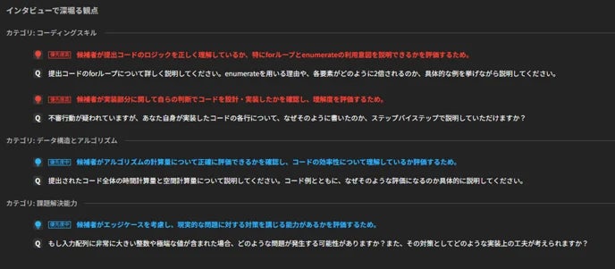 候補者が提出したコードや設計書を解析し、面接で深掘りすべき質問を自動的に生成します。これにより、面接官は事前に質問を準備する手間を省き、より本質的な面接中の会話に集中できます。また、想定される模範解答も合わせて生成されます。