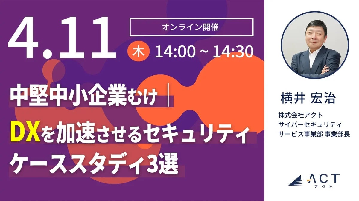 今年30周年を迎え、サイバーセキュリティ事業などを行う株式会社アクト(本社:東京都文京区、代表取締役CEO 小林 智彦 、以下 アクト)は、4月11日(木)にウェビナー「中堅中小企業むけ|DXを加速させるセキュリティ・ケーススタディ3選」を14時から開催いたします。