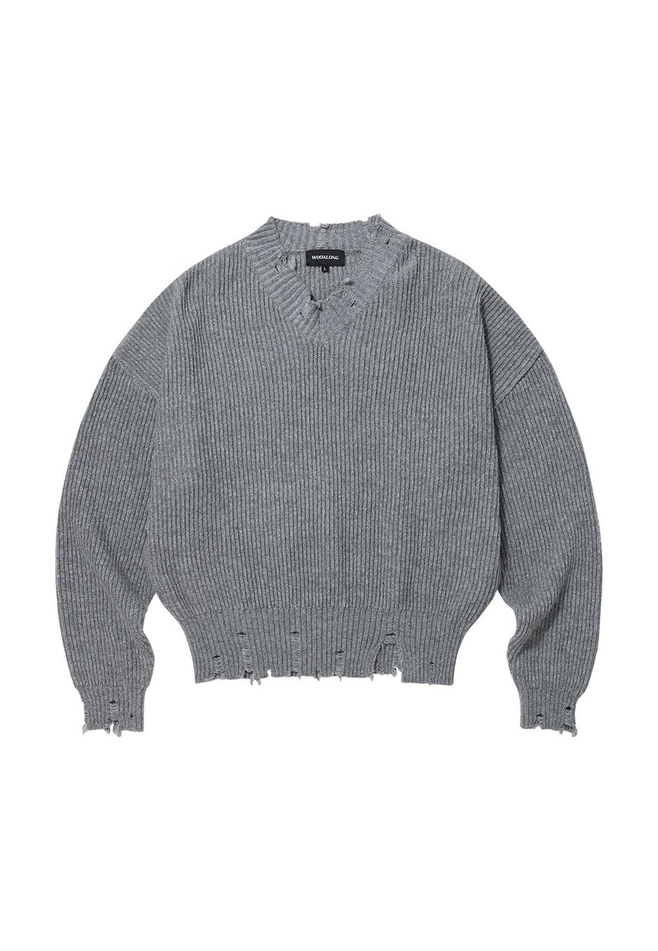 ゆったりとしたシルエット、Vネックですっきりとした首回りと、リブのダメージ加工のバランスを取ったアイテム