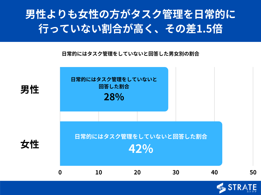 タスク管理を日常的に行っていないと回答した割合を男女別でみてみますと、男性の28%に対し、女性は42%に及びました。