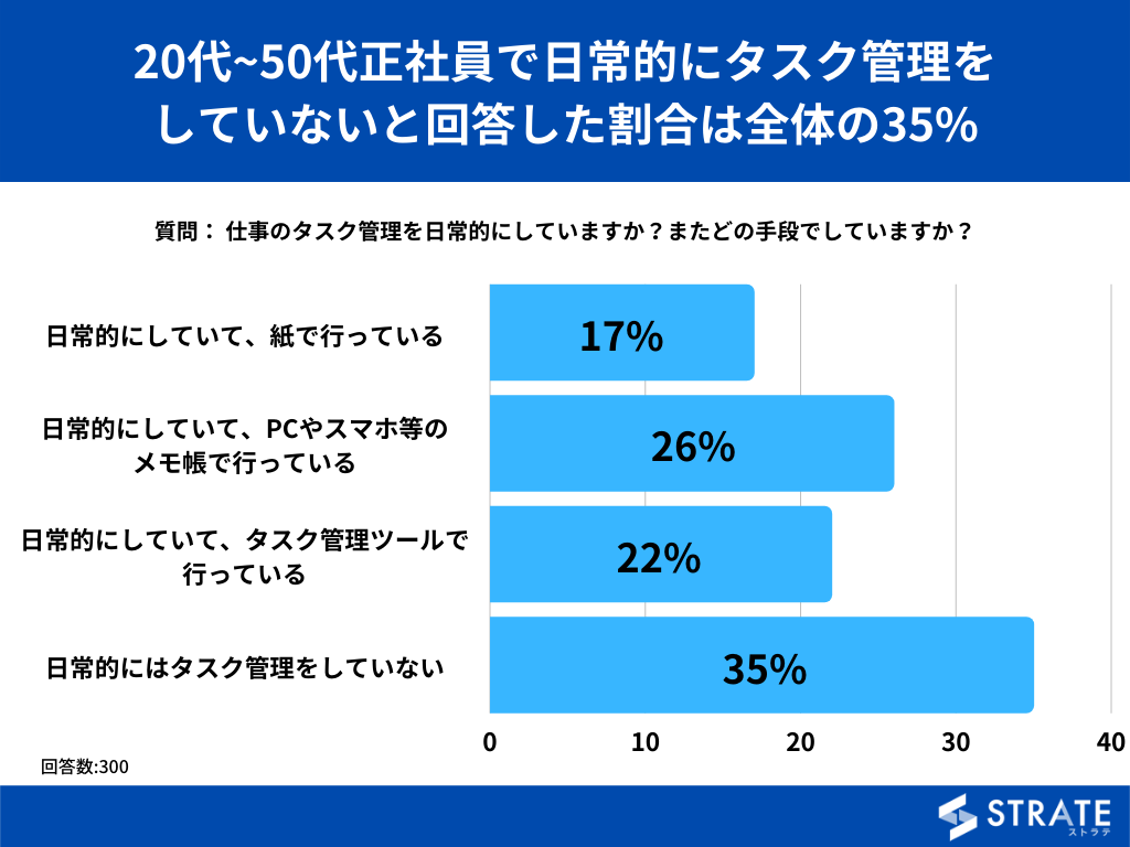 20代〜50代の男を対象とした「仕事のタスク管理を日常的にしていますか?またどの手段でしていますか?」というアンケートで最も多かった回答は「日常的にはタスク管理をしていない」で35%でした。