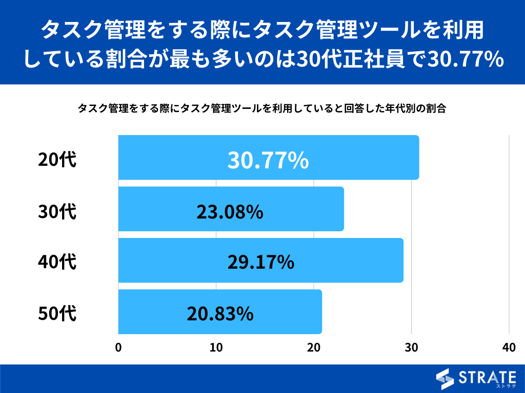 タスク管理をする際にタスク管理ツールを利用していると回答した割合を年代別でみてみますと、20代が最も多く30.77%、次いで40代が29.17%、50代は20.83%にとどまりました。