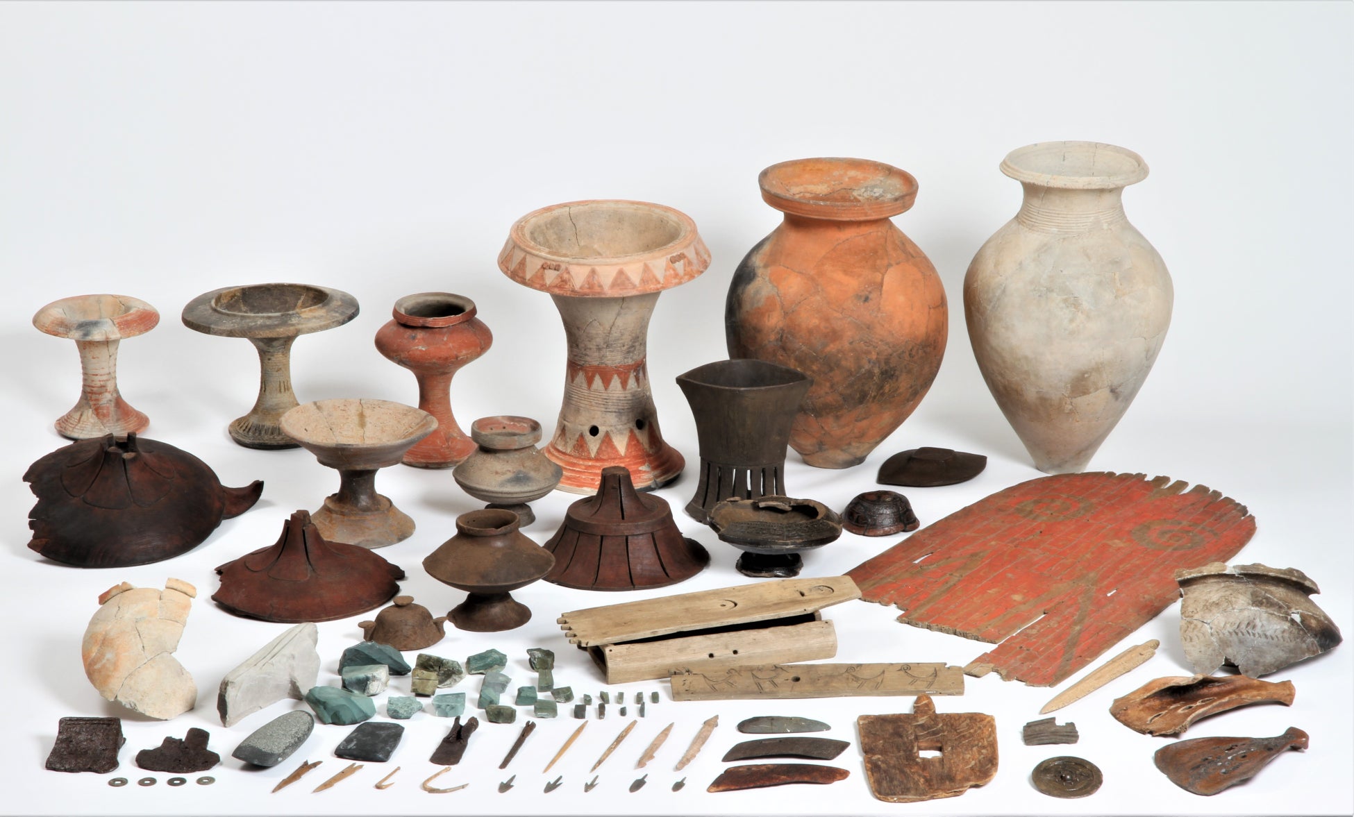 また、この遺跡に暮らしていた人びとの骨や脳、彼らが製作し、使用していた土器、石器、鉄器、木製の容器や農具、骨や角で作った漁具、美しい石やガラス製の装飾品など、様々な道具が出土しており、1,353点に及ぶ出土品が国の重要文化財に指定されています。
